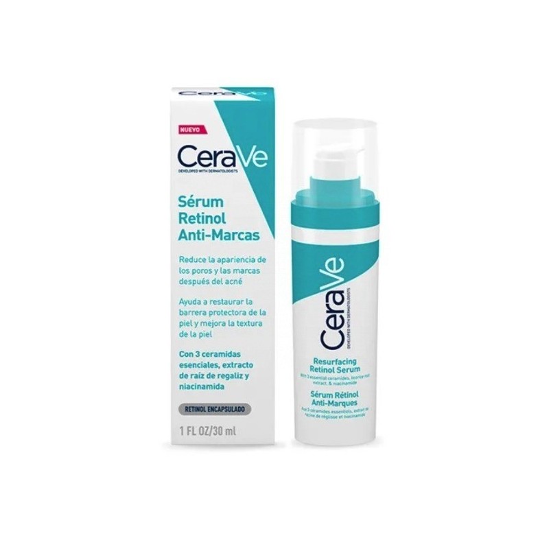 Desarrollado con dermatólogos, CeraVe Sérum Retinol Anti-marcas contiene una fórmula suave pero eficaz - con tres ceramidas esenciales, niacinamida calmante, retinol encapsulado y extracto de raíz de regaliz - ayuda a suavizar la textura de la piel reduciendo la apariencia de las marcas post imperfecciones, minimizando el aspecto de los poros y mejorando la superficie de su piel. Este sérum rejuvenecedor para manchas, ligero y de rápida absorción, ayuda a restaurar el tono uniforme de la piel y a promover una tez sana.
