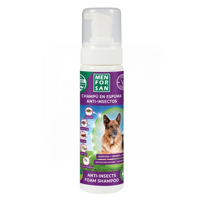 Limpia y actúa en cualquier parte del cuerpo y del pelaje de perros sin utilización de agua. La espuma contiene 3 activos naturales, MARGOSA, GERANIOL y LAVANDINO que funcionan como repelentes de infestaciones de todo tipo de insectos parásitos y voladores (pulgas, garrapatas, chinches, ácaros y mosquitos).