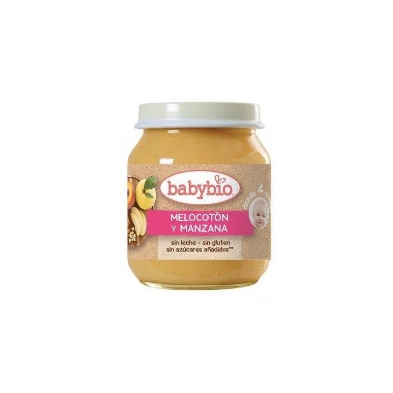 Potito de melocotón y manzana para bebes a partir de 4 meses. Babybio selecciona cuidadosamente sus ingredientes, 100% procedentes de agricultura ecológica.
